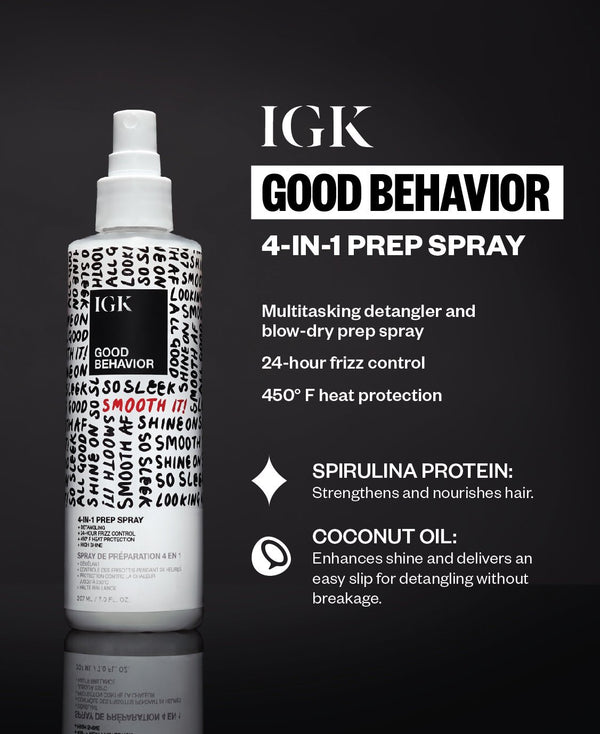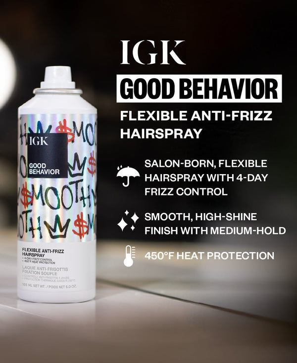 Good Behavior Prep Spray gently detangles, controls frizz for up to 24 hours, protects against heat, and adds shine. Good Behavior Smoothing Spray provides a keratin-like treatment with up to 24 hours of frizz control and 450°F heat protection, leaving hair soft, shiny, and frizz-free. Good Behavior Flexible Hairspray features 4-day frizz control and 450°F heat protection for a smooth, high-shine finish.