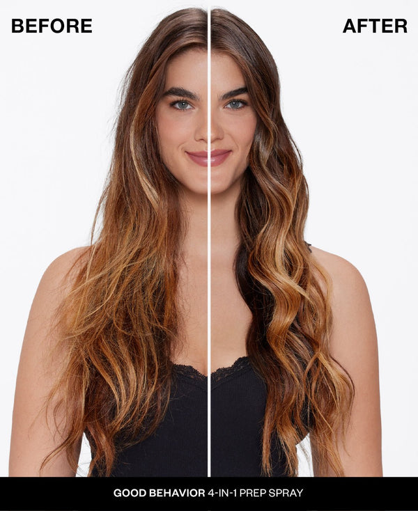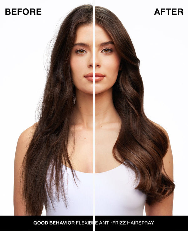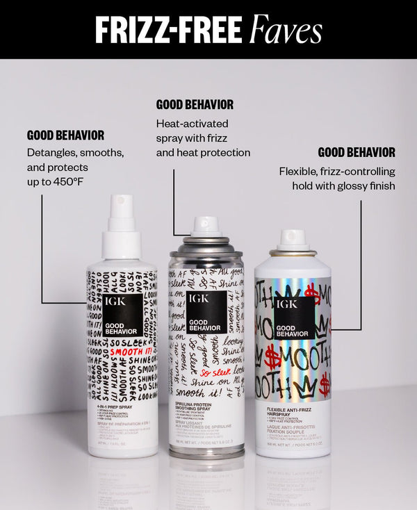 Good Behavior Prep Spray gently detangles, controls frizz for up to 24 hours, protects against heat, and adds shine. Good Behavior Smoothing Spray provides a keratin-like treatment with up to 24 hours of frizz control and 450°F heat protection, leaving hair soft, shiny, and frizz-free. Good Behavior Flexible Hairspray features 4-day frizz control and 450°F heat protection for a smooth, high-shine finish.