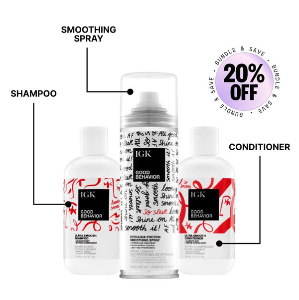 • Spirulina protein strengthens and nourishes while an innovative formaldehyde-free bonding polymer mimics the coating and smoothing properties of a keratin treatment when activated by heat. IGK Good Behavior Spirulina protein smoothing spray also helps to cut down on blow-drying time and protect against humidity, heat and UV damage, leaving hair soft, shiny and frizz-free. 24-hour frizz control. 450*F Heat Protection.